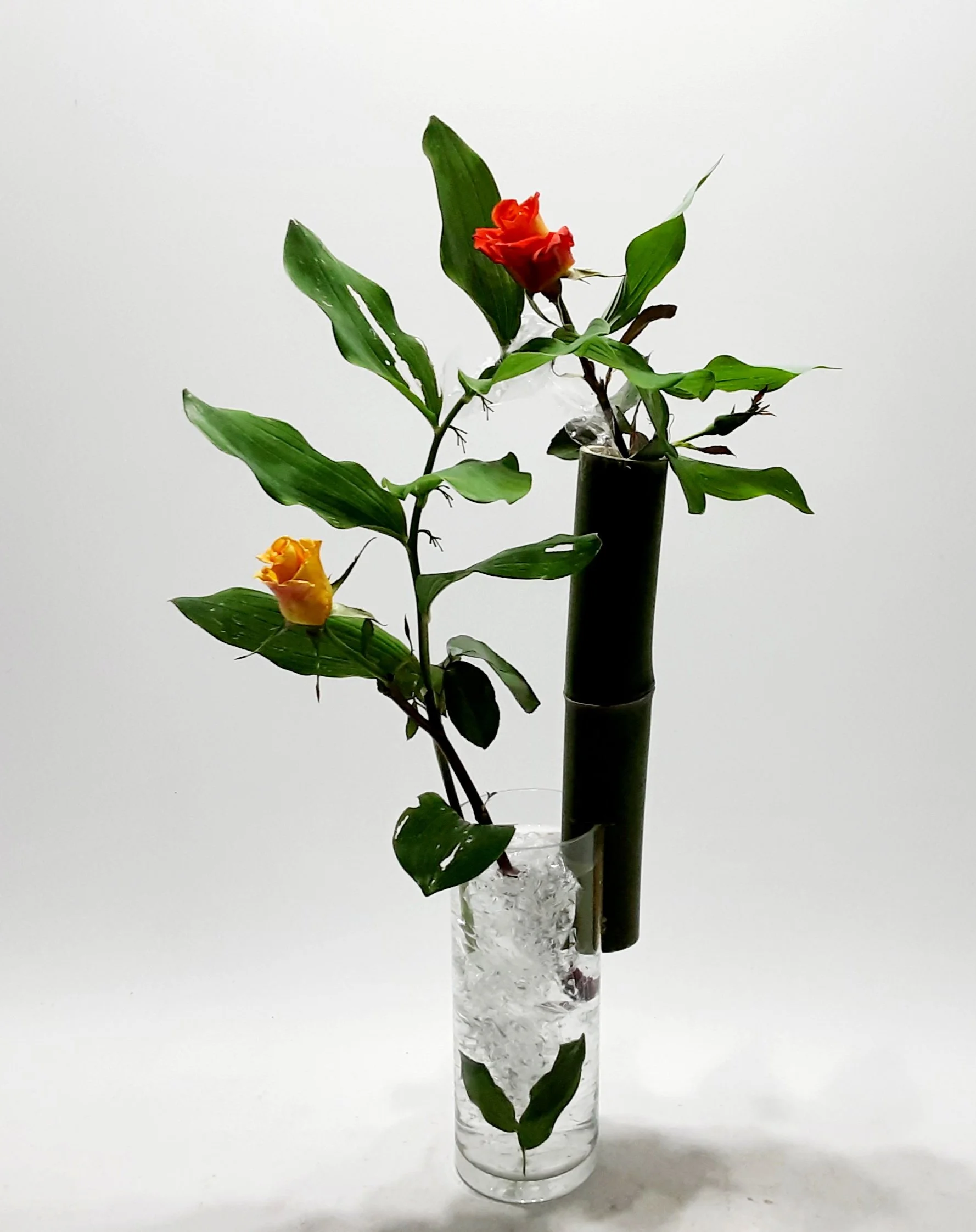 /Während der heißen Sommertage arbeiten wir gerne mit Bambus und Wasser. Einen Bambuswald findet man in Asien oft in der Nähe eines Gewässers. Die dichten, frischen grünen Triebe sorgen dafür, dass das Sonnenlicht nur gefiltert hindurchscheinen kann, was das Gefühl von Kühle hervorruft. Wir haben uns für Bambus im Wasser entschieden, um Kühle in unsere gute Stube zu zaubern. Die frischen, grünen Bambusblätter haben wir bei einigen Arrangements durch Salomonsiegel ersetzt und mit Freilandrosen arrangiert.