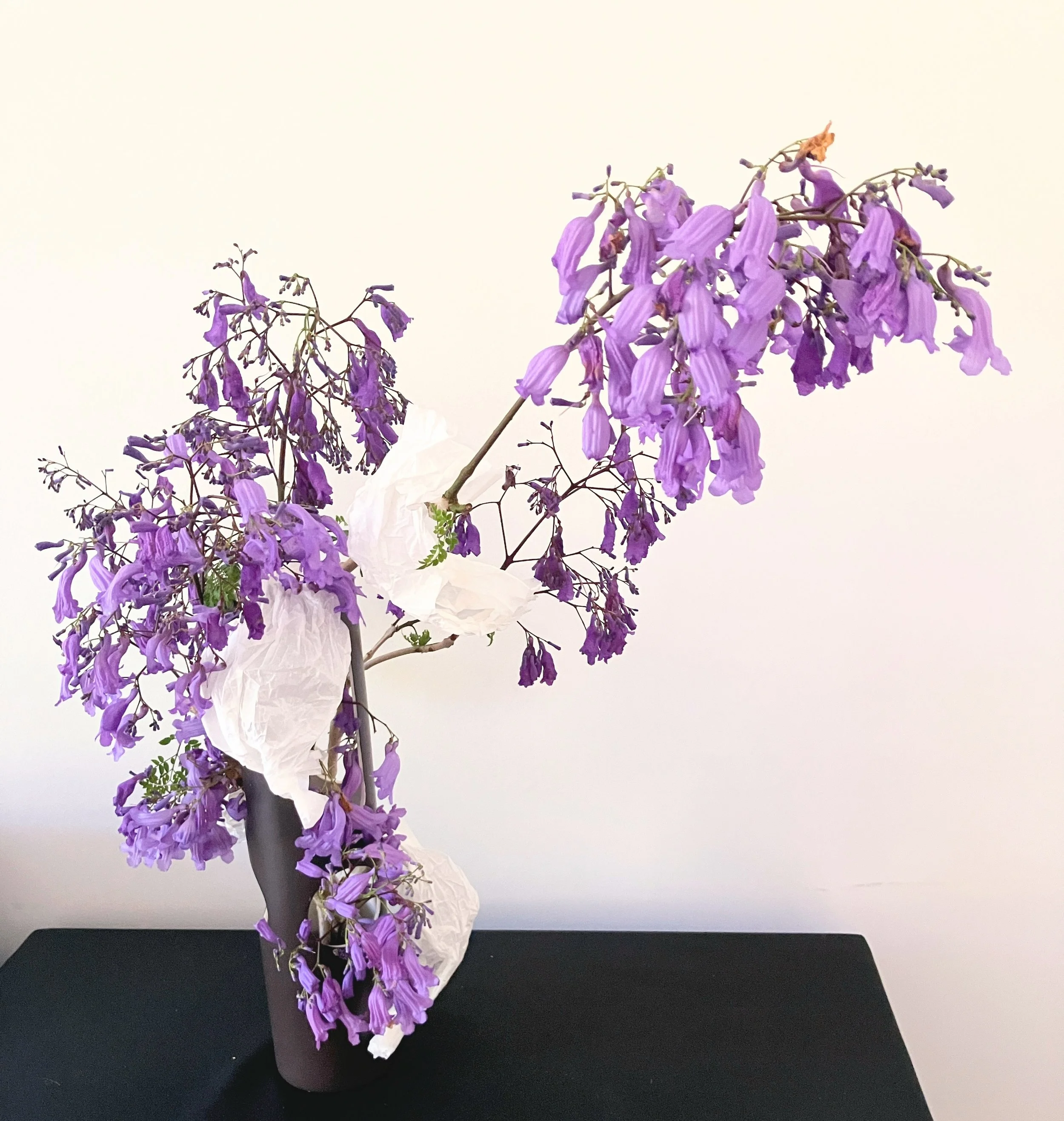 /This week, I worked online with my German students on autumn-themed arrangements, and some of them even used baking paper in their creations. With my Australian students in person, we explored a wide range of designs — some using only leaves, while even the beginners created beautiful arrangements with Tibouchina branches. The diversity of ideas and expressions is always truly enchanting.